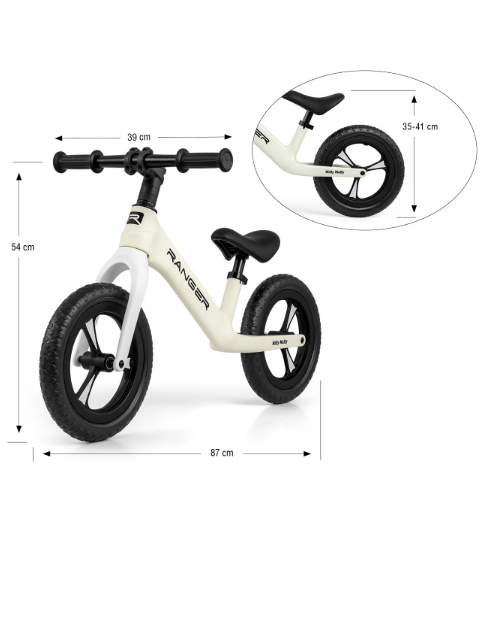 Poganjalček Milly Mally Ranger White balance bike je idealno prvo kolo za otroke, ki se učijo ravnotežja in osnov vožnje. Lahka konstrukcija, udoben sedež in stabilna kolesa omogočajo varno in zabavno učenje vožnje že od približno 2. leta starosti.