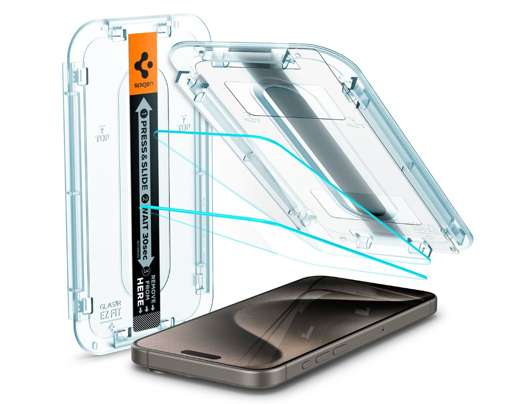 - Spigen GLAS.tR EZ Fit – zaščitno kaljeno steklo s zaščito senzorjev za Ipgone 15 pro -set 2