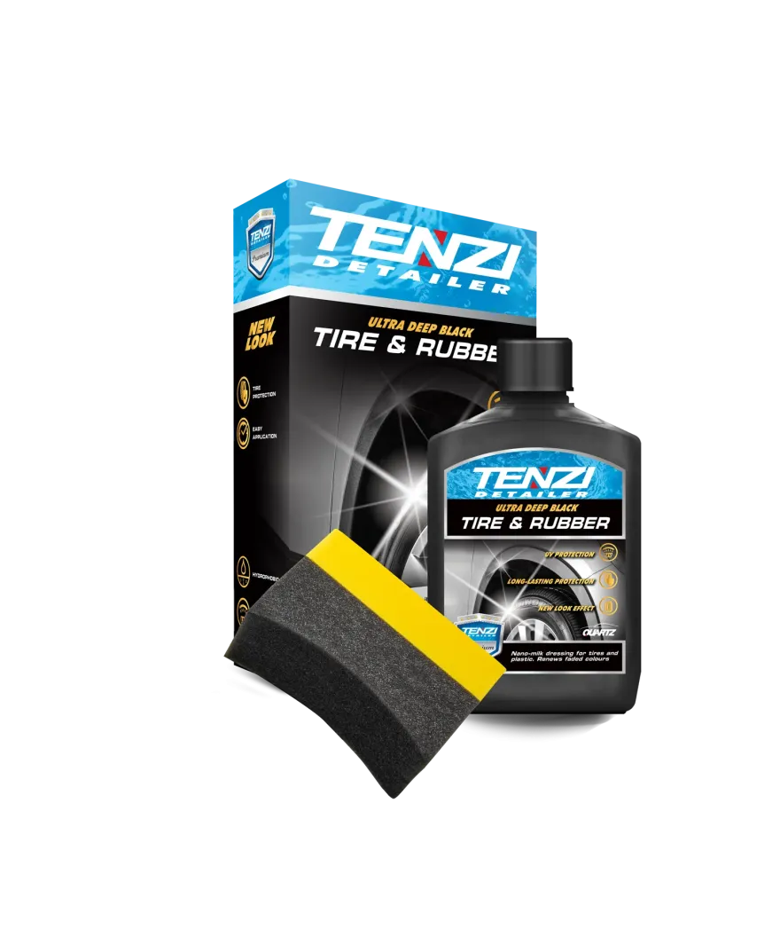 TENZI Tire & Rubber je inovativna emulzija za nego in zaščito pnevmatik, gumijastih tesnil ter plastičnih delov na vozilu. Posebna formula na osnovi emulzije prodre v površino, jo osveži, zaščiti pred staranjem, UV-žarki in umazanijo, hkrati pa ne pušča mastnih sledi.